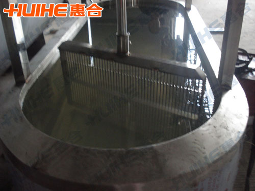 The enzyme activity of the rennet causes the milk to coagulate to a solid gel known as coagulum. This is cut with special cutting tools into small cubes of the desired size to facilitate expulsion of whey. During the rest of the curd making process the bacteria grow and form lactic acid, and the curd grains are subjected to mechanical treatment with stirring tools, while at the same time the curd is heated according to a preset program. The combined effect of these three actions – growth of bacteria, mechanical treatment and heat treatment – results in syneresis, i.e. separation of whey from the curd grains. The finished curd is placed in cheese moulds, which determine the shape of the finished cheese. The cheese is pressed, either by its own weight or by applying pressure to the moulds. Finally, the cheese is coated, wrapped or packed. Most kinds of cheese will ripened in the ripening room for deferent period. ,