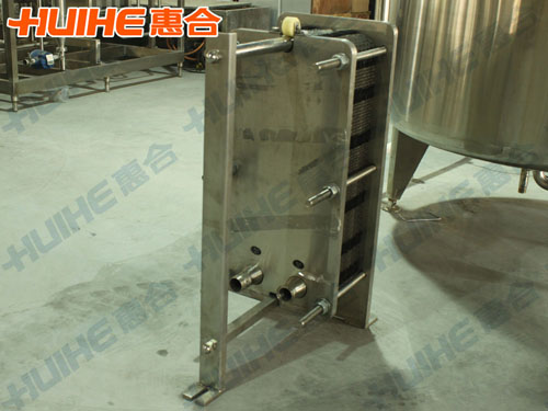 板式換熱器是由固定擋板、板片、移動擋板、立柱、上導軌、下導軌及固定螺栓組成。在固定擋板及移動擋板之間是一系列被固定的板片。每片板片均有墊圈,所以板片間構成相互平行的封閉流道,介質(zhì)在每兩塊板片之間交替流動。