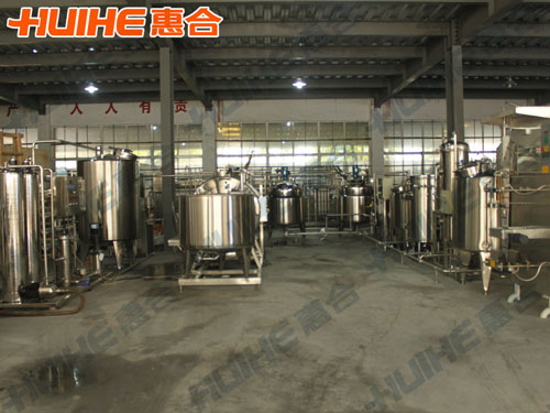 該成套設(shè)備是由水處理設(shè)備、儲(chǔ)水罐、膠體磨、漿渣分離機(jī)、老化缸、不銹鋼罐、超高溫瞬時(shí)滅菌機(jī)、真空脫氣機(jī)、殺菌鍋等單機(jī)設(shè)備組成的。