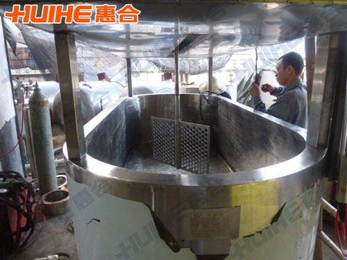 The enzyme activity of the rennet causes the milk to coagulate to a solid gel known as coagulum. This is cut with special cutting tools into small cubes of the desired size to facilitate expulsion of whey. During the rest of the curd making process the bacteria grow and form lactic acid, and the curd grains are subjected to mechanical treatment with stirring tools, while at the same time the curd is heated according to a preset program. The combined effect of these three actions – growth of bacteria, mechanical treatment and heat treatment – results in syneresis, i.e. separation of whey from the curd grains. The finished curd is placed in cheese moulds, which determine the shape of the finished cheese. The cheese is pressed, either by its own weight or by applying pressure to the moulds. Finally, the cheese is coated, wrapped or packed. Most kinds of cheese will ripened in the ripening room for deferent period. ,