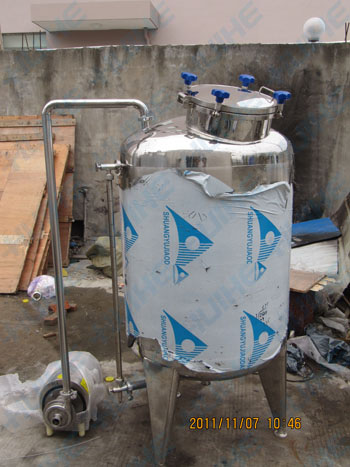開放式發(fā)酵罐:將經(jīng)過破碎、二氧化硫處理、成分調(diào)整或不調(diào)整的葡萄果漿,用泵送入開口式發(fā)酵桶(池)至桶容約4/5,留空位約1/5預防發(fā)酵時皮渣沖出桶外,最好在一天內(nèi)沖齊。加入培養(yǎng)正旺盛的酒母3-5%乃至10%(按果漿量計),根據(jù)具體情況而定。