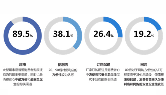 接近九成的消費(fèi)者會選擇從超市購買液態(tài)奶,其次是便利店(38.1%)和訂購配送(26.4%),網(wǎng)購的比例更低,只有不到兩成。在消費(fèi)者心中,超市也是“更方便”和“更安全衛(wèi)生”的購買渠道,其次是廠家訂購配送的渠道,僅有18.2%和13.7%的被訪消費(fèi)者認(rèn)為便利店和網(wǎng)購是“更方便”和“更安全衛(wèi)生”的購買渠道。