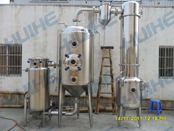 單效外循環(huán)真空濃縮器由加熱器、蒸發(fā)器、除沫器、冷凝器、冷卻器、受液罐等組成,凡與物料接觸部分均采用SUS304不銹鋼制作,本裝置適用于制藥、食品、化工、輕工等行業(yè)液體物料的蒸發(fā)濃縮。本設(shè)備濃縮時間短,蒸發(fā)時間快,能較好的保持熱敏性物料不致破壞。