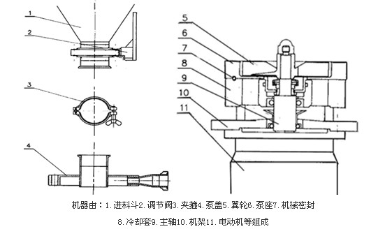 本機中與物料接觸的部分采用耐蝕不銹鋼材料。符合食品衛(wèi)生的要求。該機的工作是靠聯(lián)結在封閉電動機不銹鋼套軸上的翼輪來達到混合的目的,并由不銹鋼彈簧、壓緊密封圈、密封圈等組成機械密封裝置,進料斗與泵體用夾緊箍連接,電動機與泵座用螺栓連接在機架上,整機可作任意移動,可以不用固定的安裝基礎。