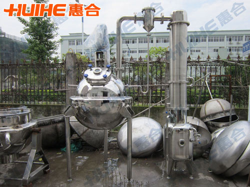 球形濃縮設(shè)備有濃縮罐、第一冷凝器、汽液分離器、第二冷凝器、冷卻器、受料桶六個部件組成。規(guī)格系列為300L、500L、700L、1000L,濃縮罐為夾套結(jié)構(gòu)冷凝器為列管式,分離器為折流分離式、冷卻器為蛇管式。減壓蒸餾,為降低液面壓力,使液料沸點相應(yīng)降低,因為液料蒸餾在沸點時進行的快,因此真空度的高低,根據(jù)液料的熱敏性,由用戶自行決定進行調(diào)節(jié)。