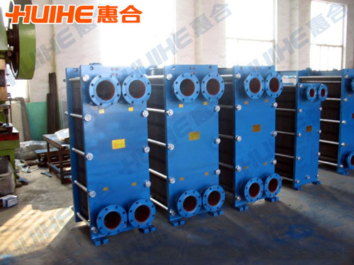 板式換熱器是由固定擋板、板片、移動擋板、立柱、上導軌、下導軌及固定螺栓組成。在固定擋板及移動擋板之間是一系列被固定的板片。每片板片均有墊圈,所以板片間構成相互平行的封閉流道,介質在每兩塊板片之間交替流動。