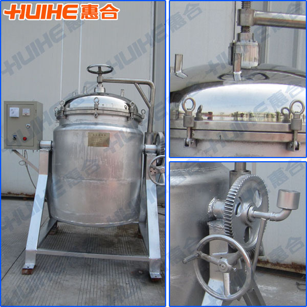 惠合生產(chǎn)的可傾式蒸煮鍋鍋體可任意旋轉(zhuǎn)90度,直到鍋中物料倒出,其材質(zhì)在客戶無(wú)特殊要求的情況下,內(nèi)外鍋體及可傾架等通常是采用不銹鋼304或316L制造的。